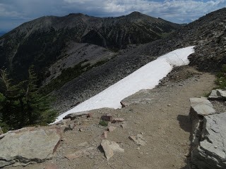 We reached the camp after a stroll down to Frozen Lake, from there the trail continued in partially shaded area where 2 snow patches could be still found, none of which posed any difficulty to descent.