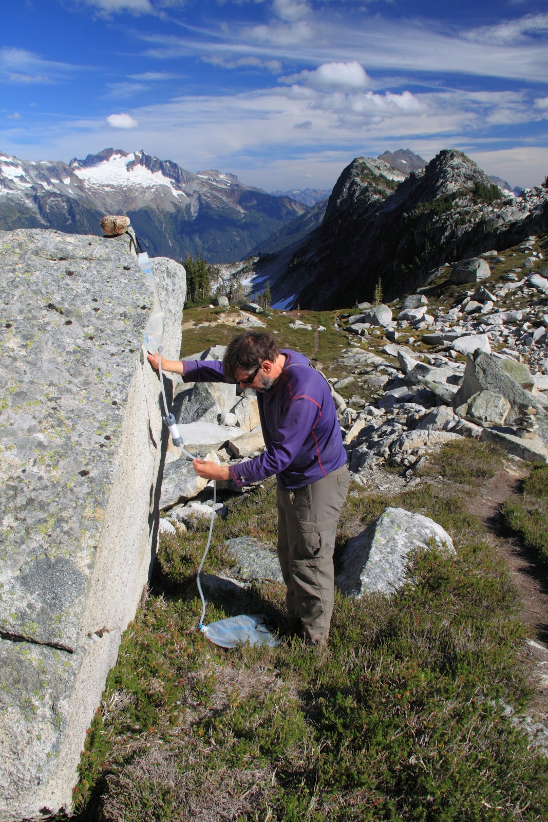 Soon we arrived to the final section, a faint path and a boulder field, and then there was the reward – a 360 degree view of North Cascades. The sound of guitar and a chorus of voices from the summit was an unusual welcome, and as we got even closer, a smell of freshly made chicken noodle soup added to our curiosity.