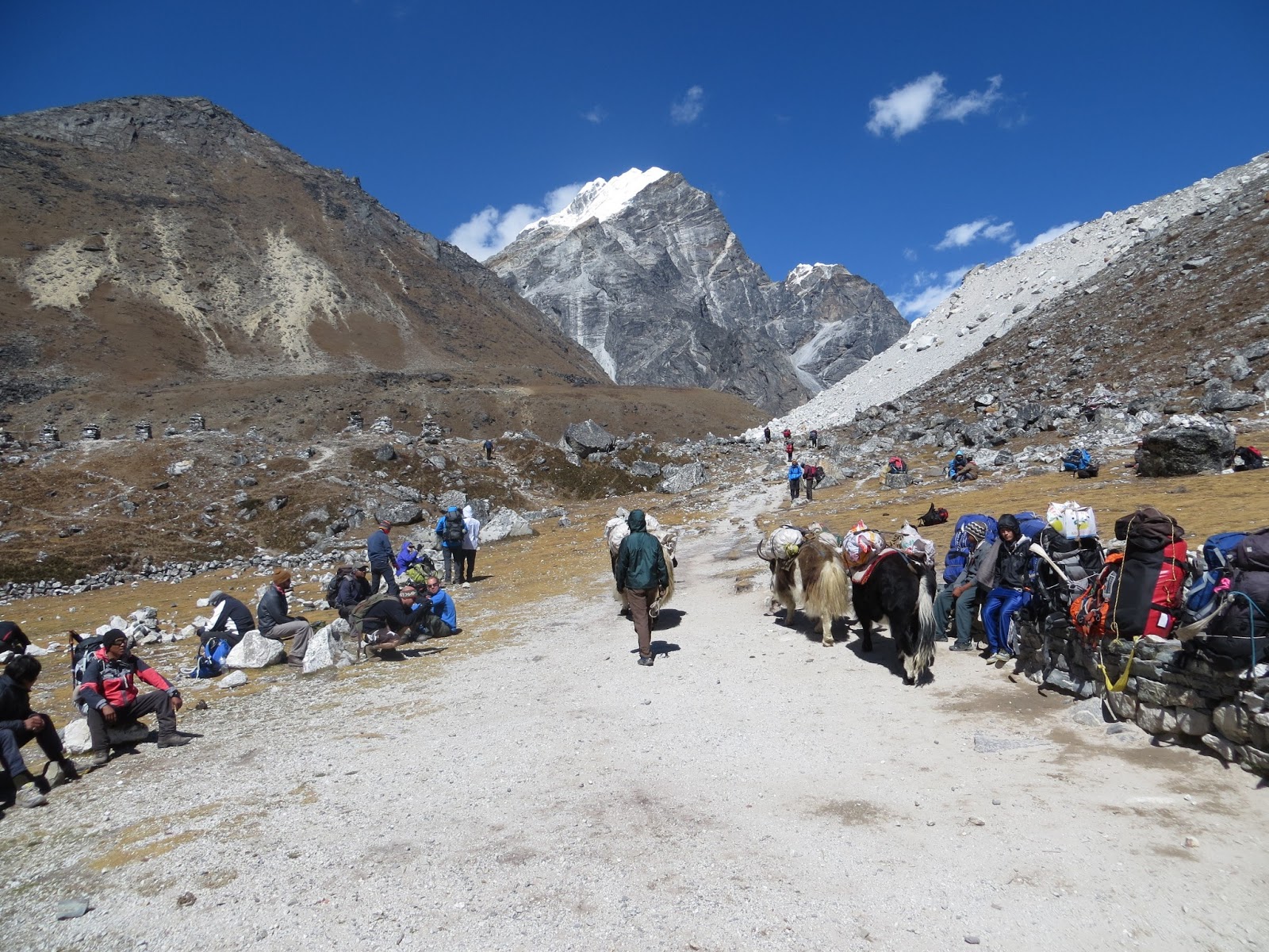 We start early in the morning. The ground under our feet is solid, and it will remain such until the afternoon sun puts mud puddles in the trekkers way. Trees are long gone, the only vegetation left consists of few species of sturdy grass. Views consist of rugged peaks – Taboche, Cholatse, Arakam Tse to the West, in the East our eyes can feast on Nankar Tshang and Pokalde. I appreciate the change in scenery – as rock and ice surrounds us we finally feel like being in the Himalayas.