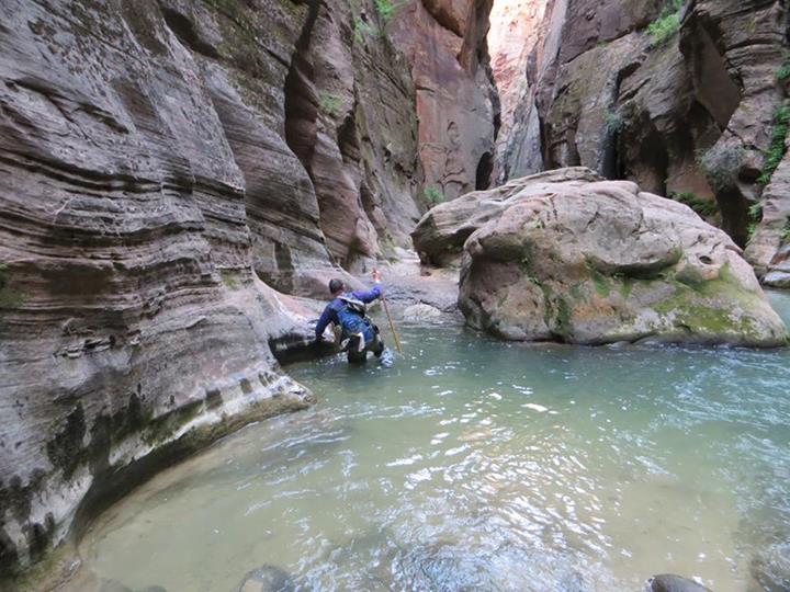 Finally we meet with Virgin River and step into its water. It is only ankle deep at first and many large rocks make it possible to make first few crossings without getting wet. My approach shoes do not handle the wet rock well, so I soon swap them for the rented 5.10 Canyoneers and with their sticky soles, they immediately become my best friend.
