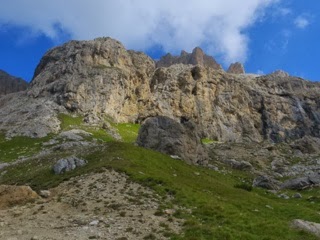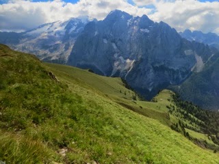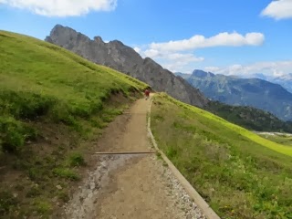 20 minutes later we hit the trail again. One more uphill, we think, and a gradual descend to Lake Fedaia. We think wrong. The trail climbs up and start traversing slope high above the valley floor. It is a rolling terrain with more ups then downs. The scenery is an opposite of what we experienced yesterday. We walk in green meadows, variety of flowers bloom around us and they attract bees and butterflies. It is a pleasant walk, even though at some spots the trail gets little too close to the cliffy edge.
