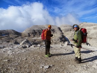 Before we reach the pass, we face another decision. To descend the whole way on foot, or to take a gondola down for the final 1800 ft which in our guide book are described as so steep we will slide on our butts. Walking it is. And even though the slope is very steep, the trail is, just as we experienced in every other gully so far, very well set, and not once our butts get in contact with the dirt. It takes us 1hr 15 min to descend. We reach Paso Pordoi at 11:01 a.m. With our appetite built up we decide for a lunch break here, spaghetti with ragu cost 8.00 euro a plate, and are of decent quality.
