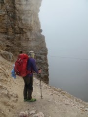 With another taxing day ahead of us we are on move at 8:12 a.m. descending from Refugio Capanna Passa atop Piz Boe via “the easier” route which involves three cable protected sections. We clip in for added protection but except for few steps along one of the ledges it is relatively easy descent which spits us back on trail 641 leading towards Passo Pordoi at 9:10 a.m.