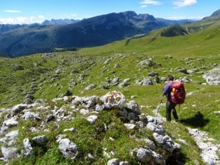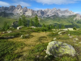 Passo St. Pellegrino, elevation 1,907 m, is the low point for the day. Replenishing our energy with spaghetti with ragú sauce and ice cream at Malga St. Pellegrino restaurant, we are ready to conquer the next uphill. It’s about 1,000 feet of elevation we have to gain towards Forcella di Padazzo, elevation 2,220 meters. The trail, leading through slopes covered with blueberry bushes, is easy to follow thanks to good markings, and even though we have to make few easy moves to pull ourselves over boulders, it’s generally quite easy going.