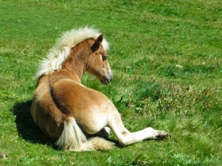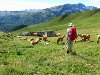 Reaching Forca Rossa, elevation 2,490 m, at 11:30 a.m., the uphill is over, for the moment. We sign the geocaché register which we find at the pass, have a quick bite, and start the downhill stroll. It is by far the most serene part of the trip, there is not a soul around us, except for horses roaming the pastures. The trail is soft mix of grass and dirt and we make a good progress.