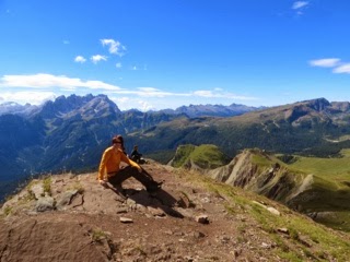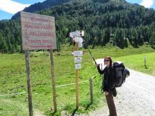 The views from up include distant mountains, closer up there is a lake and a ski lift. Once we top, we find a dirt road, wide and hard to miss, heading downhill towards our destination, Passo Valles. Luckily there is a side trail which not only cuts some distance but is more scenic, and after a long day of hiking, the cushy grass underfoot is much appreciated.