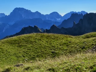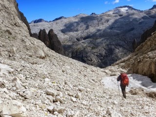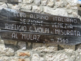 Reaching Forcella Venegia, 2,212 m, at 8:35 a.m. and Passo Venegiota, 2,303 m, an hour later, Refugio G. Volpi di Misurata al Mulaz comes in a view at 12:19. We are now at elevation of 2,560 with many more meters to go.