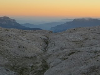 The trail markings on our map suggest the rest of way to Refugio Rosseta (Pedrotti) should be on regular trail with a section of long but easy via ferrata. The adventure; however is far from being over. For somebody (like me) who does not thrive in heights, the narrow path along a cliff with a view of a valley over 2,000 feet bellow, is not necessarily an idea of easy trail. I do not dare to look down, staring at every step in front of me I pray for this section to be over soon. And then a rock outcrop comes which we have to cross. Another one soon follows, and as we find out, most of this “trail” involves exposed scrambling, rarely protected by cable.