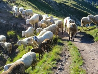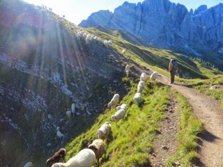On the trail by 8:00 a.m., heading uphill without warm up. The scenery is beautiful, Passo Valles becomes a dot way bellow us, we are back in a world of high mountains. At first the dirt trail leads through meadows full of purple blooms. It’s steep but easy to negotiate, and even the several cable protected sections are a breeze.