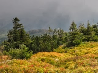 After a short side trip to Sněhová Kotlina (Snow Basin), place where frequent avalanche activity can be seen, and a short off trail scramble we reconnect with our route; however alternate trail comes shortly, one that leads to the top of Červená Hora (Red Mountain). This trail takes from gravel road to a dirt path, heading uphill among forest of kosodřevina. It’s a pleasant climb, not really steep with more and more views bellow us. Today they are obscured by clouds, and only occasionally we see a village or two, but the views we lack bellow are more than generously replaced by beautiful scenes here in the heights. Clouds rise around us, occasionally letting sun rays through. These sun breaks don’t last more than 15 – 20 seconds but during the short time foliage of ever present blueberry bushes turn crimson red, and straws of grass bath in golden glow.