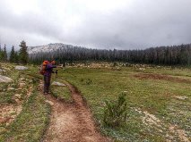 In order to keep warm we speed up through Long Meadow. The flat open terrain allows for faster pace and the clouds cover any views that could otherwise distract us. When I start feeling tired, at first I attribute it to the fact I did not have a chance to eat proper lunch. But then comes dizziness and I know this can be a problem. While in last few hours I concentrated all my effort to keeping my body temperature up I forgot to acknowledge that we hiked in altitude of 9000+ feet and simply pushed too much. No wonder my sea level used to body is ready to go on strike. Cold or not I do the only thing I can think of. I slow down and sporting a snail pace I make my way towards Cathedral Pass with no additional problems.
