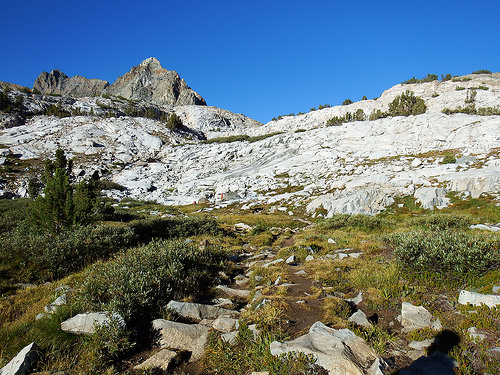 Whitebark pines accompany the first several hundred vertical feet of our descent. I like their gnarly appearance, a reminder of the harsh conditions bestowen upon this region by the nature. In this environment they rarely grows tall enough to obscure the views. Yet another reason to love these trees.