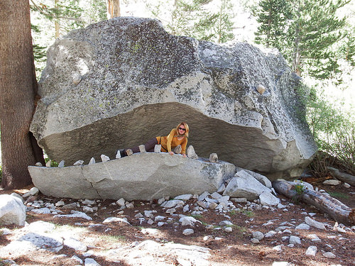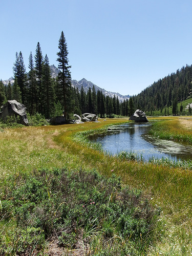 We are on a steady downhill, passing an unnamed lake which is a home to a family of frogs and several other bodies of water, smaller tarns mostly, in which the surrounding mountains proudly reflect. And then there is more downhill yet when the trail drops us into the Le Conte Canyon. Le Conte Canyon brings Little Pete Meadow with some beautiful campsites, rock monster – probably the most photographed rock along the trail, ranger station where we can check conditions for the upcoming few days and unfortunately for Richard and his wife who are part of Kevin’s group Le Conte Canyon brings the end of their JMT journey. Blisters Richard developed earlier during their trip are not healing properly and to avoid more serious problems they made a decision to walk out.
