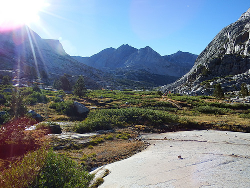 From where we are it is close to 2000 ft of elevation we have to gain before we reach the outlet of Lower Palisade Lake and the next available campsite. The ascend is made on a series of a tight switchbacks and while the grade is somewhat steep and makes us sweat, there is no actual staircase to be found here and that makes me very happy. The views into Le Conte Canyon are outstanding from here and since we are nearing 10,000 ft again the scenery gains back its alpine feel. Sarah and Michelle are climbing the Staircase too. They maintain slightly faster pace and agree to hold a campsite for us and once again we spend the evening sitting on granite slabs, enjoying the trail camaraderie and don’t go to bed until the stars start shining above our heads.