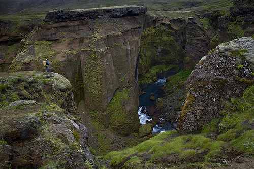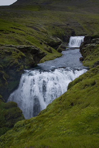 At the very end of the trail the most impressive of Skoga’s waterfalls awaits us. Skogafoss is 82 feet wide and has a drop of 200 feet. According to legend, the first Viking settler in the area, Þrasi Þórólfsson, buried a treasure in a cave behind the waterfall. The legend continues that locals found the chest years later, but were only able to grasp the ring on the side of the chest before it disappeared again.