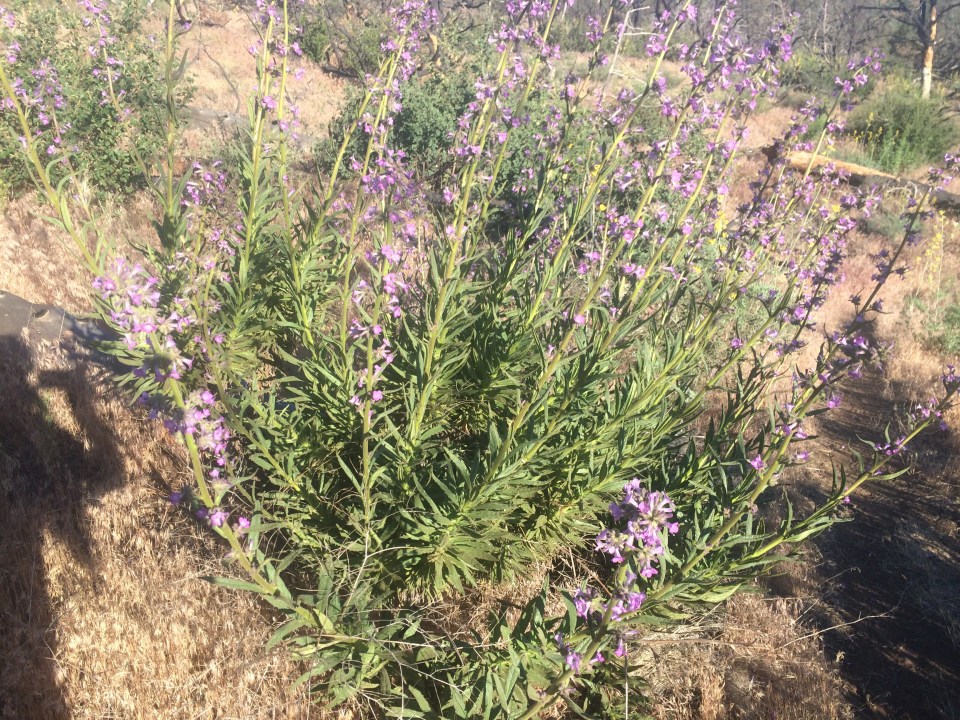 Today the trail took us through another burn and our friend Poodle Dog Bush was back, and its tiny purple blooms, as poisonous as they were, livened the scenery together with other flowers, orange and yellow.