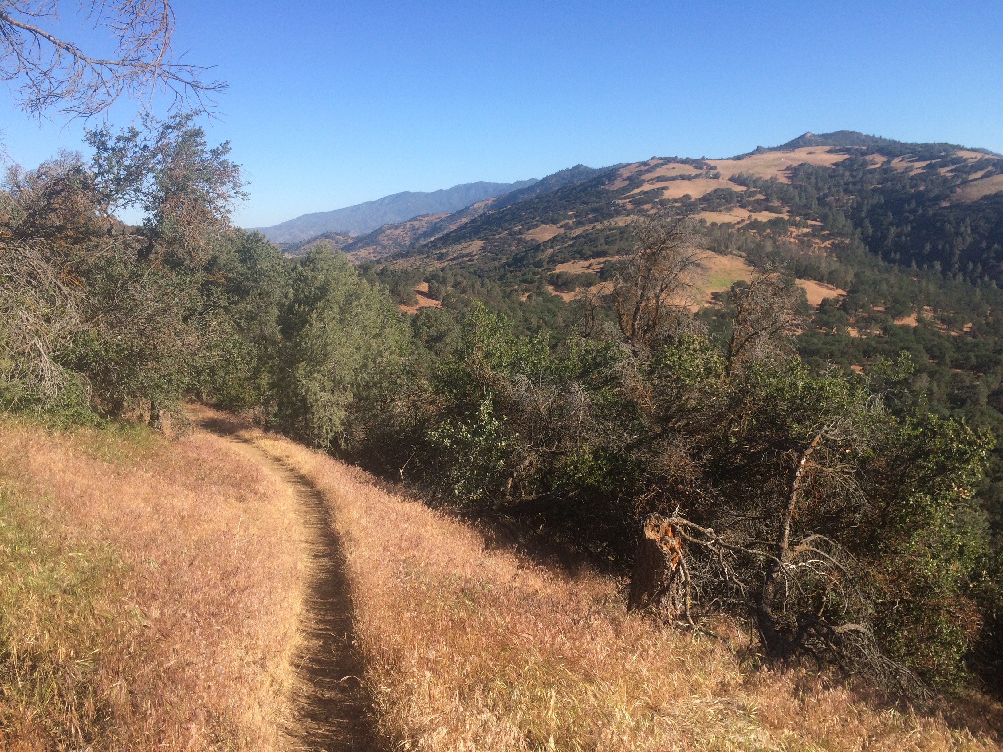 We haven’t stayed in the burn for long. Couple miles at most and then we walked into meadows and grove of oaks. Plenty of sites could be found here tucked in the shade of the trees. They were lovely sites with a view of the golden grasses swaying in the breeze. We took a short break here before continuing up the hill.