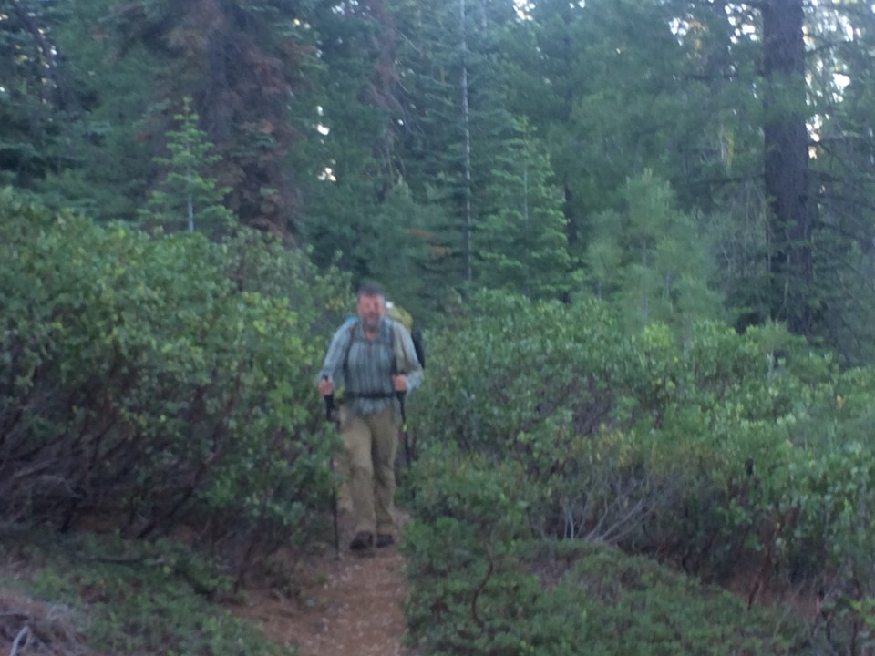 We talked about the snow we will encounter tomorrow on our way up back to the trail when I heard a sound similar to a pole hitting the ground. I looked up expecting fellow hikers. Instead I was staring at a big bear who was busy gnawing at a fallen tree trunk. He did not move much when he noticed us. At first he didn’t move at all but when we made more noise, he took few steps behind the log he was gnawing at and watched us. We made more noise still and finally we got enough space to move through. The bear watched us make a switchback and then he went back to his dinner.