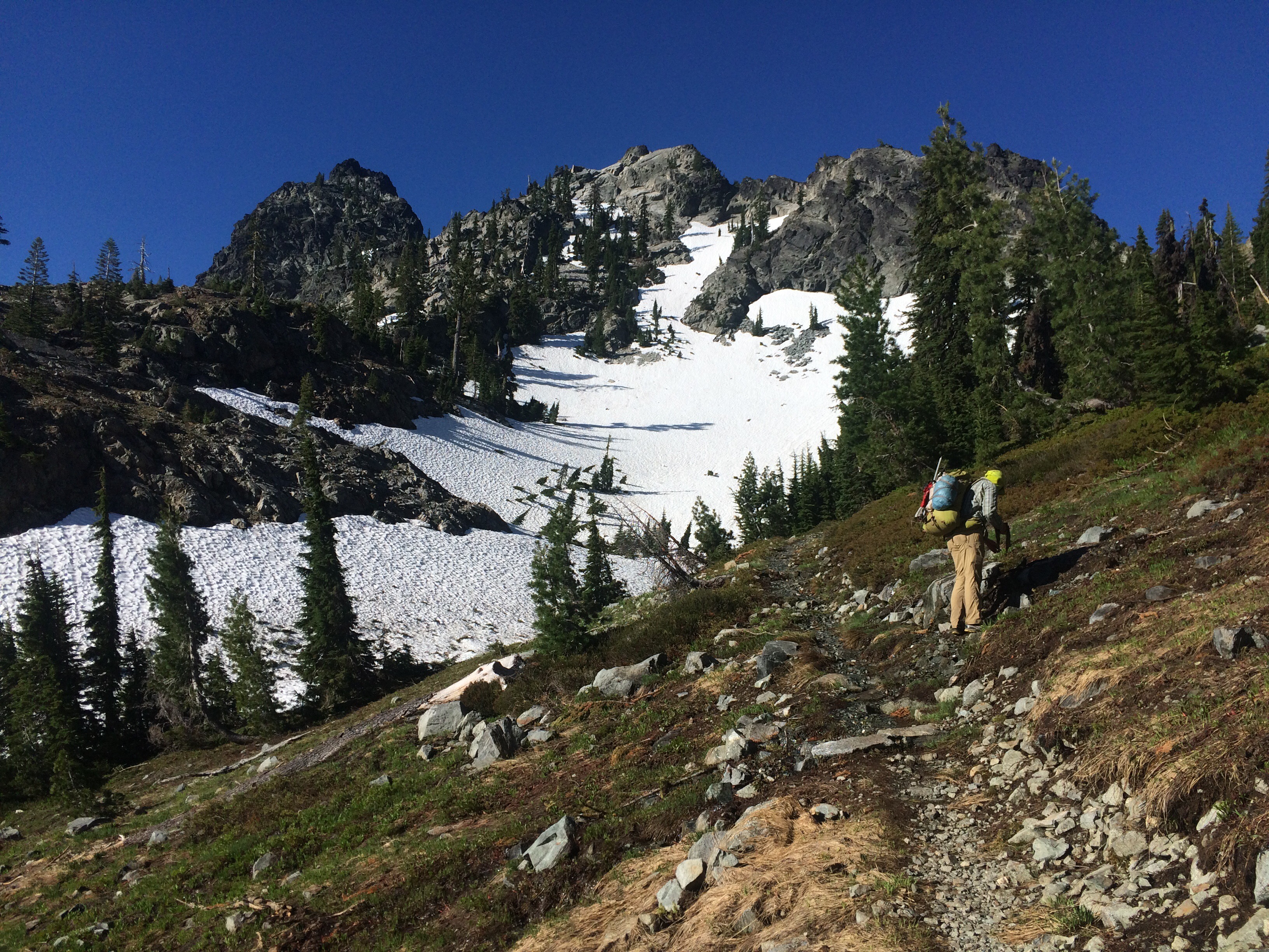 But before we got there, we still had lots of elevation to climb. Up and down we went to a ranger station, not manned quite yet, where we stooped for lunch, and then we climbed some more. I was happy with our progress, at 3:00 p.m. we had all the climbing done, all we had to do was to cruise to the lake 3 miles away. But the trail was not quite done with us yet. It threw the second snow patch in our way.