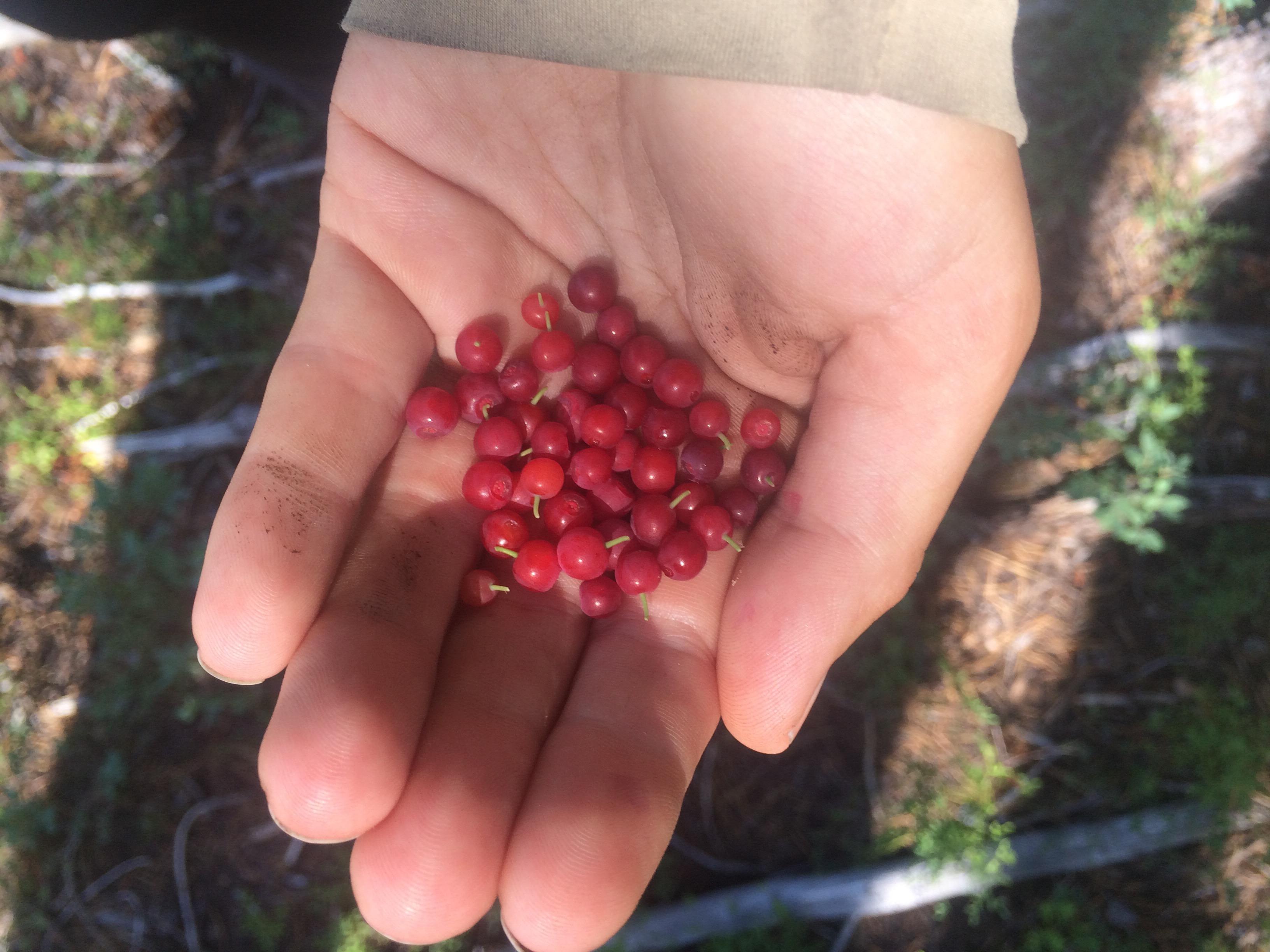 At the shore of one of these lakes we scored our first huckleberries. We saw many bushes higher up in the mountains but up there the plants have not yet even bloomed while here the red berries beckoned us to stop and pick.