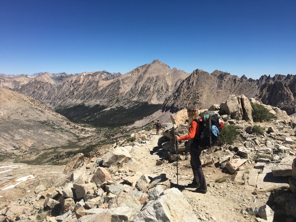 There is still little bit of snow on the north side of the pass. It’s easily manageable, we even enjoy a short glissade and then there is a long downhill ahead of us along side a singing creek and some of the most rugged peaks I have ever seen.