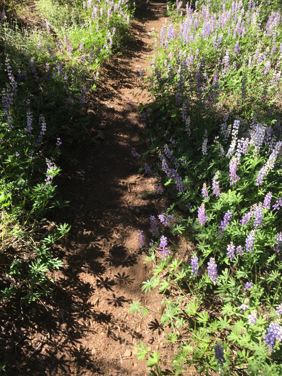 Atop the climb is a plateau with lupin and lava rock, several taller trees. I want to take a photo and guess what. My camera tells me memory is full. I know I had 403 photos left in the morning and there is no way I took that many. I check the card. There is about 380 black frames in the card as somehow the camera managed to turn on when I was walking and happily snap all the frames. I spend 10 minutes deleting them. Then I take the shot.