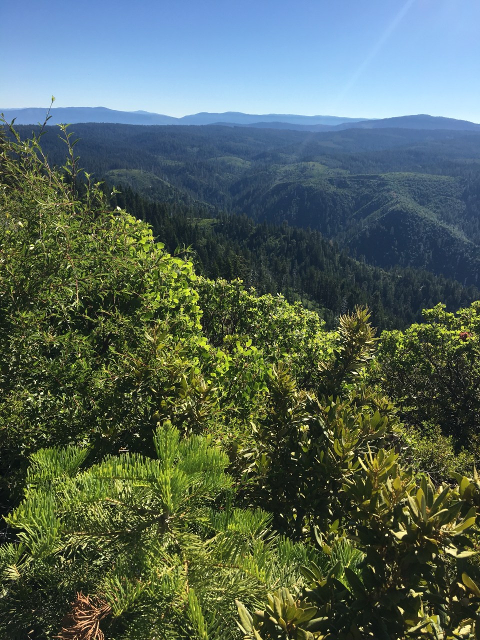 At Lookout Rock we wave to the views. The trail starts dipping down towards Bear Creek, taking us deeper into the valley. We meet several hikers, stop to talk to few. One couple alerts us to a cougar activity in the area. Apparently they saw two late last night at their site close to bear creek.