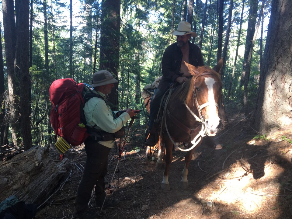 We bottom at Bear Creak, very nice stream surrounded by big leafy plants. It’s great place for a lunch before we start climbing out of the valley. Not a great place to get water, the stream is little tricky to reach. So to replenish our bottles we move to a spring about a mile away. Mark, the horse guy catches up with us there. Apparently there was an accident. One of his horses fell on her back. She is miraculously OK, just showing few scratches but the saddle that carried Mark’s gear is destroyed and Mark suffered a leg injury causing him to bleed quite a bit. He needs to go off trail. Luckily Swayed carries InReach, a satellite communication device, through which we are able to alert Mark’s wife and she initiates rescue from a trailhead few miles ahead.