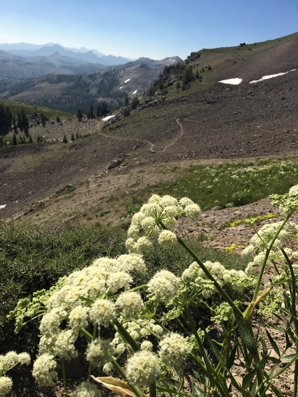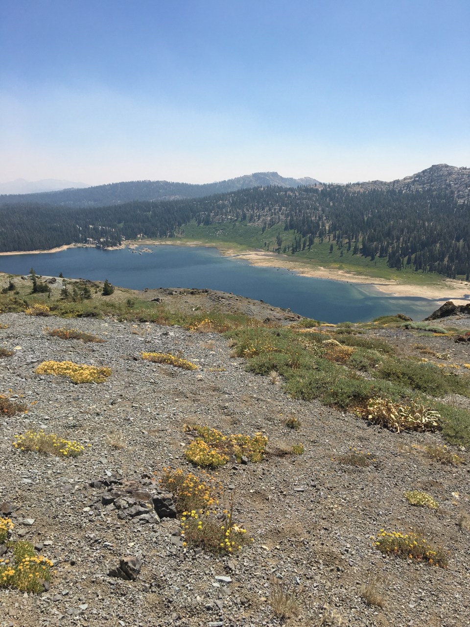 Our of Carson Pass is a 500 foot climb graded so well we hardly notice that we are climbing. We share the trail with many day hikers. At least the first few miles. Then we are alone again in meadows full of wildflowers. There are some new ones today – a blue wild iris, wild onion, and couple more we don’t recognize.