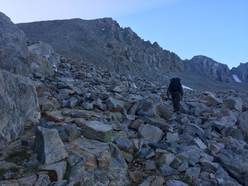 Alarm rings at 5:30 a.m. Quick breakfast and we are on our way to attempt Split Mountain. We walk along the lake, we have to do some rock hopping over the outlet and some smaller streams but otherwise it’s an uneventful walk. The climb starts afterwards.