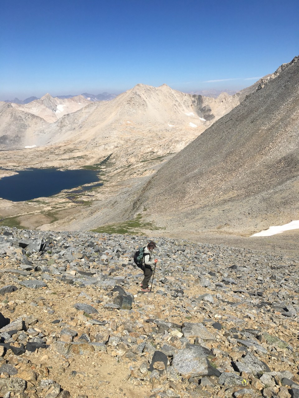 Marjorie Lake is beautiful. It sits in a basin bellow Pinchot Pass with many impressive peaks surrounding it as well. It’s super windy. I freeze when filtering water and even in my down coat later on when I go take photos, I’m not 100% cozy. Both Dave and I are in our sleeping bags by 7:00 pm bracing ourselves for the cold night.