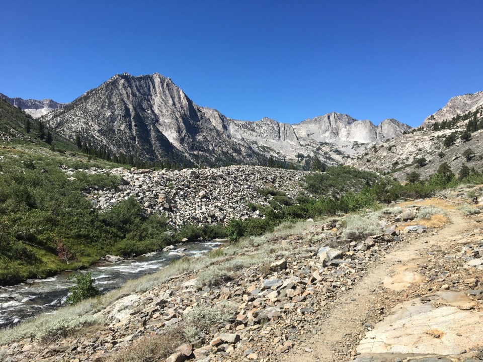 Picking up speed is not easy today. I’m tired. And the trail is rough. We’re heading towards Wood’s Creek suspension bridge and it’s the worst downhill of the entire Sierra I’m sure. Rock, roots, washouts, and giant steps we have to down climb make it difficult to maintain speed, plus there are more short uphills than I can count. Finally the suspension bridge gets in view and we know the suffering is over. At least for next hour and half when we eat lunch and I take a nap. Afterwards we have to climb 2,000 feet to Rae Lakes.