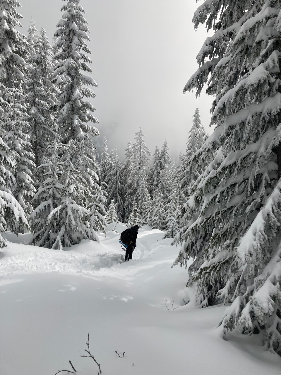 From this intersection another sign points in the direction of Dirty Harry’s Peak. The grade steepens and though the path is easy to follow even if under snow (you are now following a remnant of an old logging road), you need to watch for some switchbacks and little obstacles – creek crossings and postholing, especially in areas where the snow covers downed trees. Snowshoes are almost always helpful here if you are attempting the peak during winter.